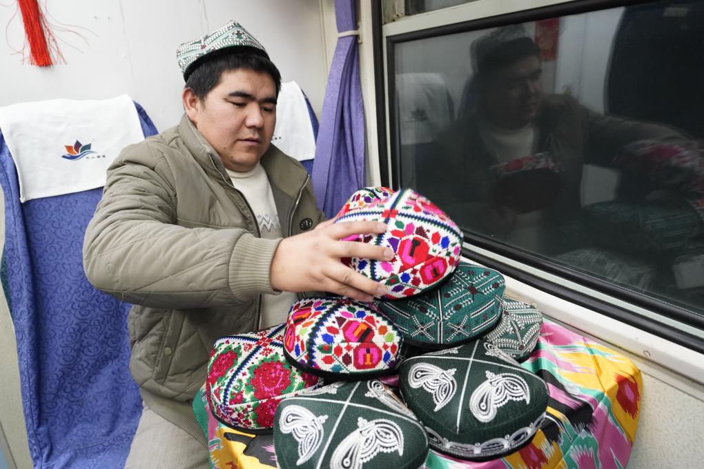 他的鄰座,喀什市商戶艾麥提·阿卜杜熱依木將一頂頂花帽在小桌上細(xì)心排開。石榴花、巴旦木紋在艷麗的底色上綻放,針腳細(xì)密如繡?!昂芏嘣谀辖ぷ魃畹呐笥?,過年要回老家,”艾麥提一邊整理一邊說,“挑選一頂花帽回家,是份地道的新疆心意?!?/p>