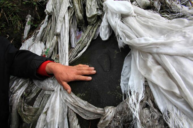 我們從瀑布旁的一座房屋穿過去,就到了森木扎寺。這座寺院只是一間12平方米左右的石頭小屋,只能被稱作佛堂。木板搭成的屋頂掛著經(jīng)幡,寺院外面是一個已經(jīng)被熏黑的煨桑爐。寺里沒有一名僧人,平時只有一名61歲的管家阿旺列夏看管,他是勒布溝的門巴族,曾是一名寧瑪派僧人。據(jù)阿旺列夏介紹,森木扎曾有一個作惡的女妖,蓮花生大師用神力將她扎于此,于是建起了這座寺廟。我們隨他來到蓮花生大師修行洞內(nèi),他指著石壁上面的四處腳印,稱有處腳印是倉央嘉措留下的,他還指著瀑布旁邊的一塊石頭說:“這就倉央嘉措的寶座,曾是他給信教群眾講經(jīng)說法的地方?!?/p>