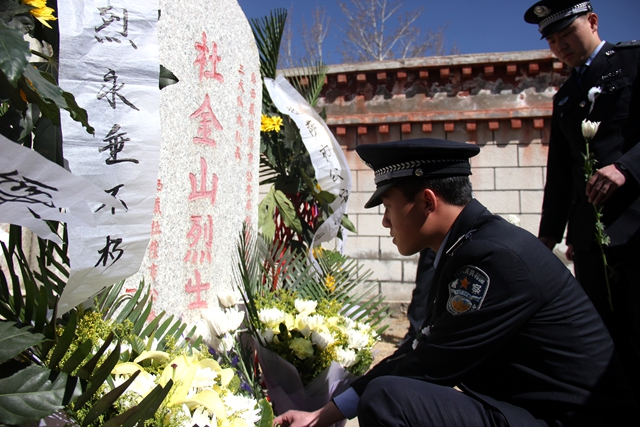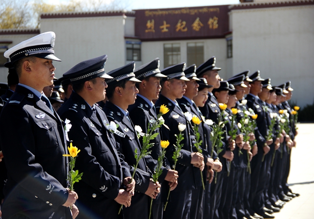 緬懷革命先烈,傳承革命精神?!拔覀儾荒芡洖闋幦∶褡褰夥藕腿嗣裥腋6I身的烈士。他們拋頭顱、灑熱血換來了我們今天的幸福生活,他們是人民心中永恒的豐碑?!痹诂F(xiàn)場的拉薩市公安局張警官說。