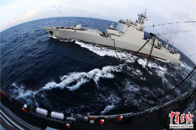 2017年2月6日,??谂瀰⒓舆h(yuǎn)海訓(xùn)練,圖為海口艦進(jìn)行橫向補給。時明華攝
