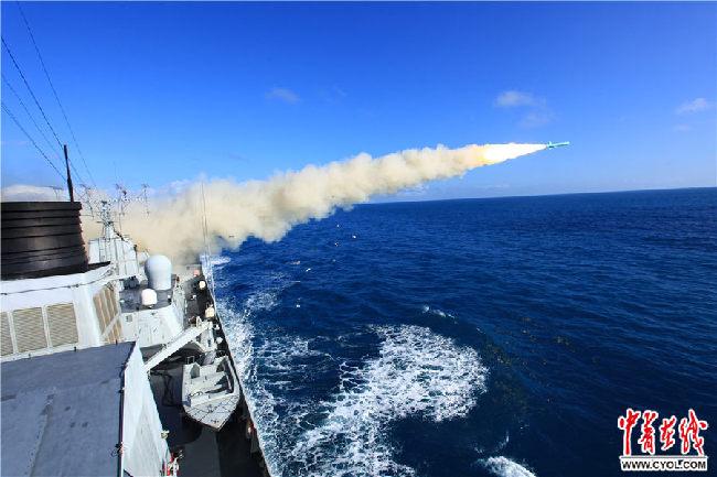 2008年11月8日,海口艦在某海域參加實彈演習(xí),圖為??谂灠l(fā)射反艦導(dǎo)彈。