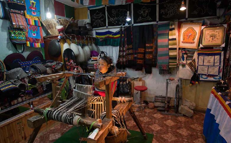 店內(nèi)的款式多樣、設(shè)計新穎、做工精細的背包、挎包、圍巾、毛毯等,簡直是拉薩民間手工編織工藝品的大集合,珠杰的小女兒正在編織氆氌。