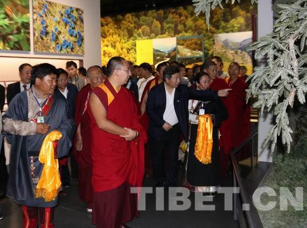 △班禪聽(tīng)取青海省委常委、統(tǒng)戰(zhàn)部部長(zhǎng)公保扎西對(duì)展覽的介紹。