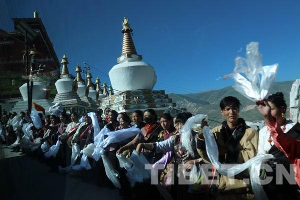 班禪大師到來(lái)當(dāng)天,結(jié)古寺大門(mén)口煨桑的香煙繚繞,用白石灰畫(huà)的迎接道花紋華美,玉樹(shù)市的群眾在道路兩旁歡迎班禪大師的車(chē)隊(duì)。