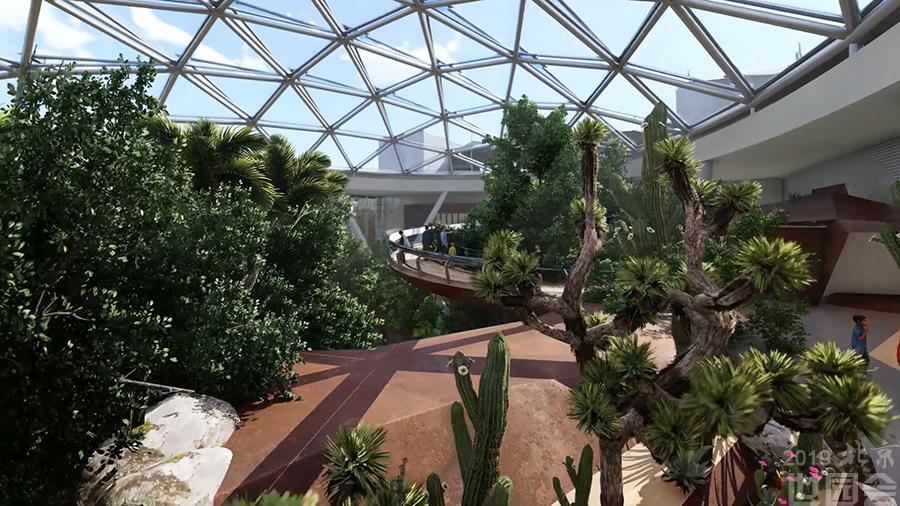 植物館建筑面積約10,000平方米,建筑設計理念為“升起的地平”,建筑表面機理以植物根系為靈感,龐大的垂墜根系向下不斷蔓延,將植物原本隱藏于地下的強大生命力直觀呈現(xiàn)給參觀者,不僅產(chǎn)生強烈的視覺沖擊,更帶領參觀者踏上一場以感受植物根系力量為起點的奇妙植物世界之旅。