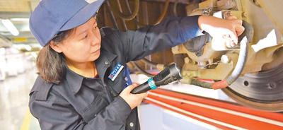 王曉霞在檢查動車組車底速度傳感器狀態(tài)。王利明攝