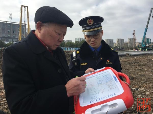 張海清用畫畫板向丁橋二號(hào)港執(zhí)法長(zhǎng)吳東超溝通問題。