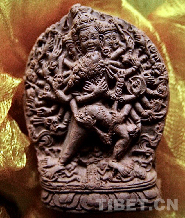 最后我又去了一次千佛崖,那里有幾家常年做擦擦的。轉(zhuǎn)完甘珠爾塔出來,不抱希望的,順便去那幾家做擦擦的攤子看一眼。攤位上擺出來的所有樣品,又一次讓我失望了。突然,目光掃到一個(gè)堆滿擦擦的舊箱子,在它的角落里臥著一個(gè)落滿塵土的大威德金剛擦擦,眼前一亮,心跳也加快了,將它從箱子里取出來細(xì)看:牛頭人身的大威德金剛,雙角和火焰般的頭發(fā)指向上方,34只手臂持不同法器呈放射狀層疊排列,身前擁抱明妃羅浪雜娃,腳下踩踏一眾惡鬼。這所有的一切緊湊而精巧的排布在直徑僅僅5厘米的圓形中!
