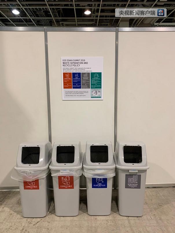 在G20新聞中心的垃圾桶。大阪將垃圾分為四類:可燃垃圾、易拉罐和玻璃瓶、報(bào)紙和雜志、塑料和塑料瓶。