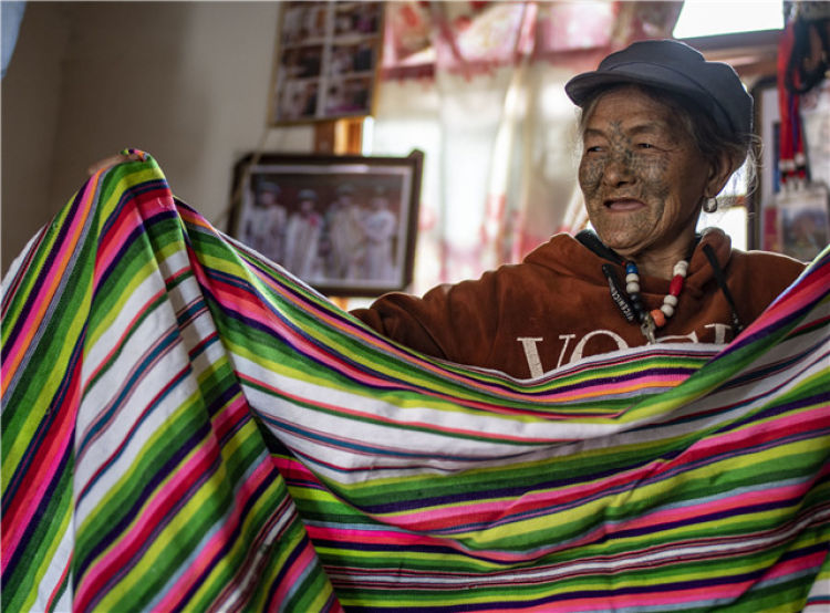 2019年4月21日,云南省貢山獨(dú)龍族怒族自治縣獨(dú)龍江鄉(xiāng)迪政當(dāng)村獨(dú)龍族婦女李文仕在家里展示她親手織的獨(dú)龍?zhí)骸T颇鲜?019年宣布,獨(dú)龍族、德昂族、基諾族3個(gè)“直過民族”實(shí)現(xiàn)整族脫貧,歷史性告別絕對貧困。新華社記者 江文耀 攝