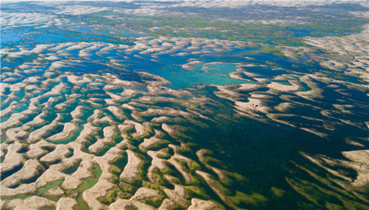 這是庫布其沙漠中利用黃河分凌減災(zāi)的水進(jìn)行沙漠生態(tài)修復(fù)形成的沙漠濕地景色(2018年6月9日無人機(jī)拍攝)。新華社記者 彭源 攝