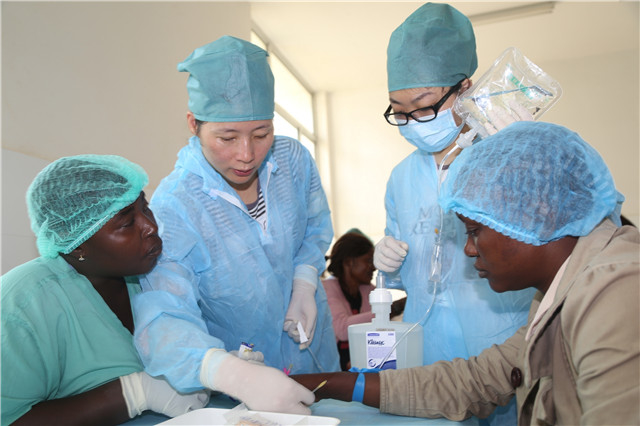 2014年12月10日,在塞拉利昂首都弗里敦,中國人民解放軍援助西非抗擊埃博拉疫情醫(yī)療隊(duì)為中塞友好醫(yī)院開展輸液培訓(xùn)活動(dòng)。新華社發(fā)(戴欣攝)