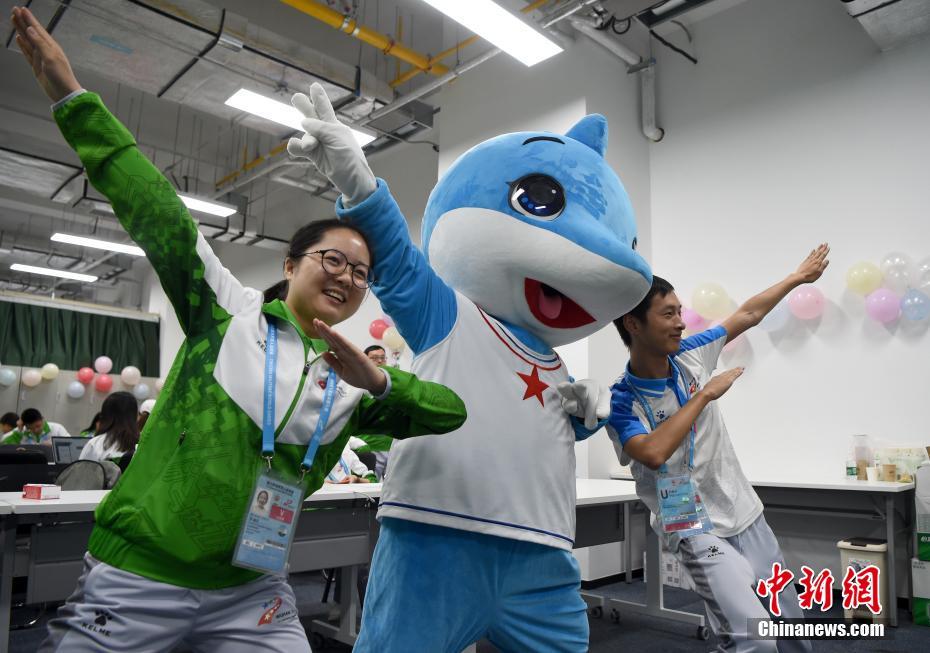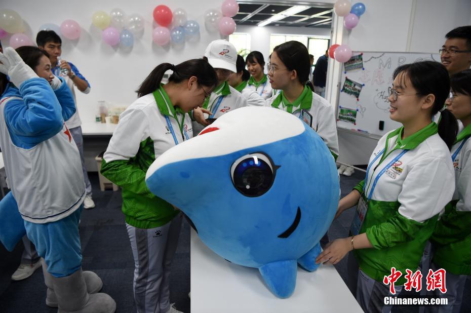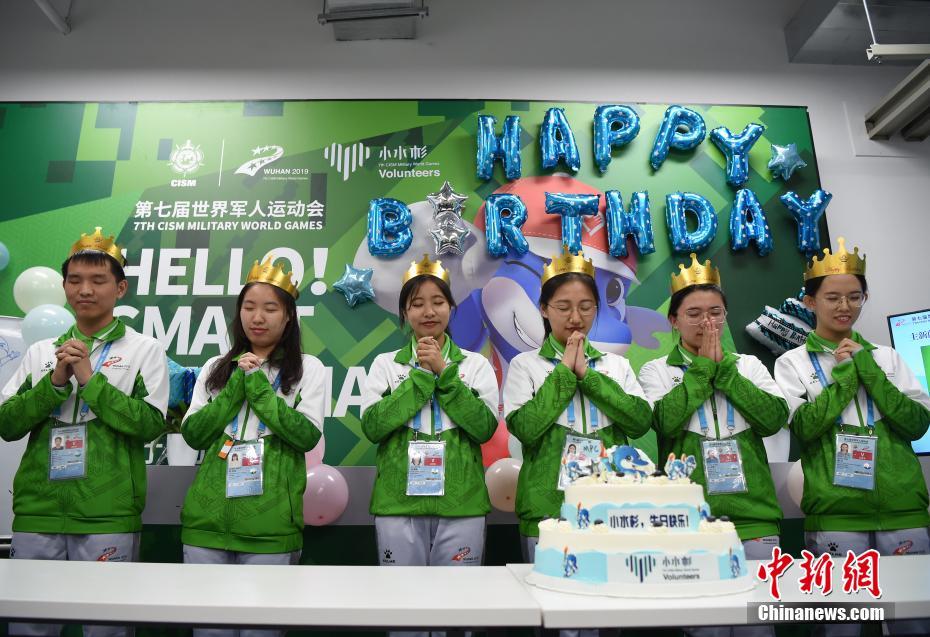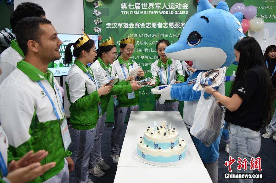 10月24日,幾位在第七屆世界軍人運(yùn)動(dòng)會(huì)舉辦期間迎來生日的志愿者“小水杉”在主媒體中心內(nèi)的“志愿者之家”過集體生日。圖為軍運(yùn)會(huì)吉祥物“兵兵”向過生日的志愿者們送上小禮物。中新社記者 侯宇 攝