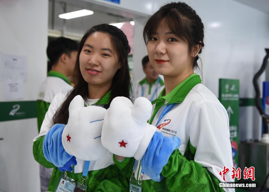 10月24日,幾位在第七屆世界軍人運(yùn)動(dòng)會(huì)舉辦期間迎來生日的志愿者“小水杉”在主媒體中心內(nèi)的“志愿者之家”過集體生日。圖為兩名志愿者帶著軍運(yùn)會(huì)吉祥物“兵兵”的手套合影。中新社記者 侯宇 攝