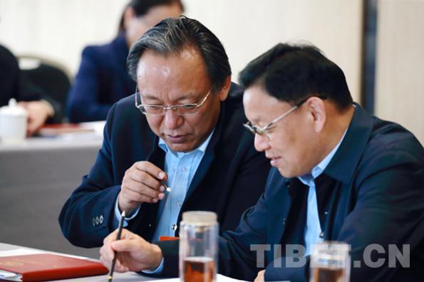 圖為格桑羅布(左)與其他委員討論政府工作報(bào)告 攝影:陳衛(wèi)國