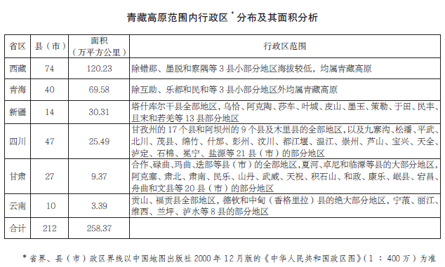 在行政區(qū)劃上,青藏高原范圍涉及6個省區(qū)、212個縣(市),即西藏自治區(qū)(錯那、墨脫和察隅等3縣僅包括少部分地區(qū))和青海?。ú糠挚h僅含局部地區(qū)),云南省西北部迪慶藏族自治州,四川省西部甘孜藏族自治州和阿壩藏族羌族自治州、木里藏族自治縣,甘肅省的甘南藏族自治州、天祝藏族自治縣、肅南裕固族自治縣、肅北蒙古族自治縣、阿克塞哈薩克族自治縣以及新疆維吾爾自治區(qū)南緣巴音郭楞蒙古自治州、和田地區(qū)、喀什地區(qū)以及克孜勒蘇柯爾克孜自治州等的部分地區(qū)。