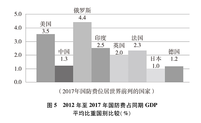 從國防費占國內(nèi)生產(chǎn)總值比重看,2012年至2017年,中國國防費占國內(nèi)生產(chǎn)總值平均比重約為1.3%,美國約為3.5%、俄羅斯約為4.4%、印度約為2.5%、英國約為2.0%、法國約為2.3%、日本約為1.0%、德國約為1.2%。中國國防費占國內(nèi)生產(chǎn)總值的平均比重在國防費位居世界前列的國家中排在第六位,是聯(lián)合國安理會常任理事國中最低的。