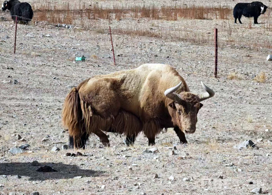 圖為羌塘國家級(jí)自然保護(hù)區(qū)的一頭金絲野牦牛與放牧的家畜牦牛和諧相處(革吉縣野保員洛洛提供)