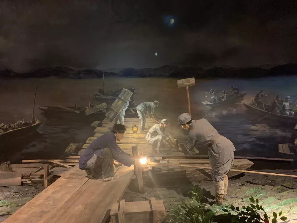 中央紅軍長(zhǎng)征出發(fā)紀(jì)念館中再現(xiàn)了軍民為避免敵機(jī)偵察被發(fā)現(xiàn),在夜間搭建浮橋的場(chǎng)景