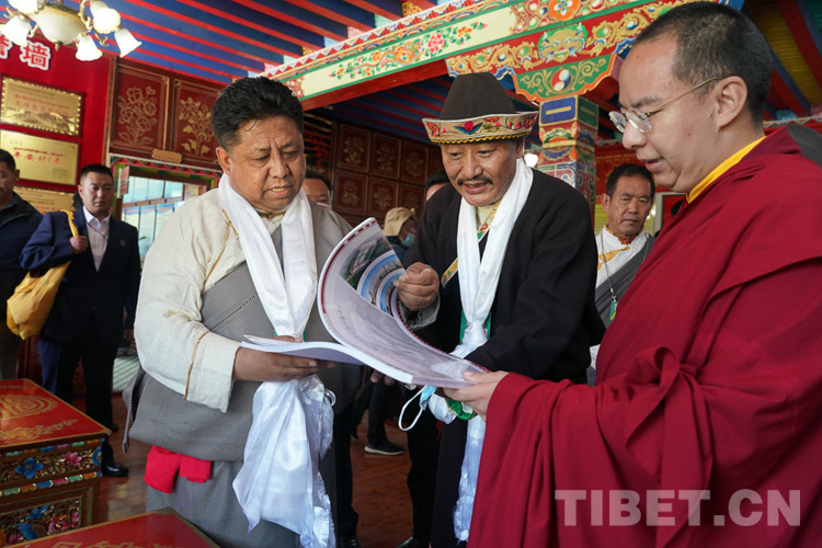 圖為十一世班禪在林芝市巴宜區(qū)巴吉村翻看村莊規(guī)劃書 攝影:王淑