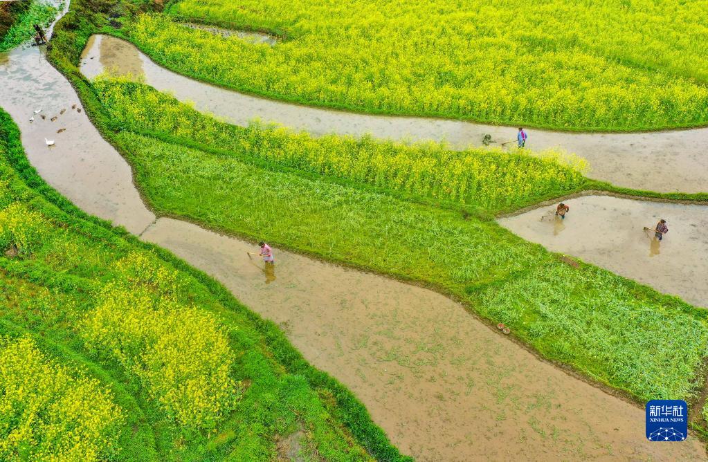 3月30日,貴州省銅仁市玉屏侗族自治縣亞魚(yú)鄉(xiāng)郭家灣村的農(nóng)民在田間勞作(無(wú)人機(jī)照片)。新華社發(fā)(胡攀學(xué) 攝)
