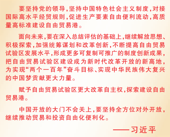 “建設(shè)自由貿(mào)易試驗區(qū)是黨中央在新時代推進改革開放的一項戰(zhàn)略舉措,在我國改革開放進程中具有里程碑意義?!?/p>
