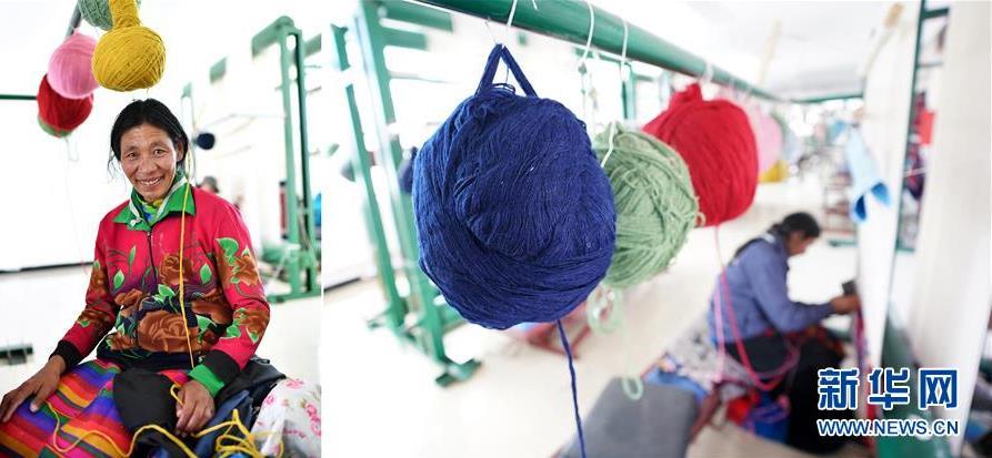 拼版照片:左圖為西藏阿里地區(qū)改則縣物瑪鄉(xiāng)村民央卓在噶爾縣康樂(lè)新居服裝地毯加工廠;右圖為央卓在噶爾縣康樂(lè)新居服裝地毯加工廠工作。2017年,央卓和家人從改則縣物瑪鄉(xiāng)搬遷到噶爾縣康樂(lè)新居易地扶貧搬遷安置點(diǎn),住進(jìn)了125平方米的新居。2018年7月,央卓和女兒參加了康樂(lè)新居服裝地毯加工廠的培訓(xùn),在家門(mén)口找到了工作(7月25日攝)。 新華社記者 詹彥 攝