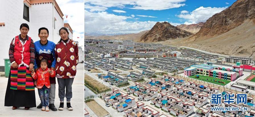 拼版照片:左圖為西藏阿里地區(qū)日土縣東汝鄉(xiāng)阿汝村村民丹木真(中)和妻子扎西拉姆(左)、女兒南嘎曲增(右)、小女兒列旺桑姆在噶爾縣康樂(lè)新居易地扶貧搬遷安置點(diǎn);右圖為噶爾縣康樂(lè)新居易地扶貧搬遷安置點(diǎn)一角(無(wú)人機(jī)照片)。2018年,丹木真和家人搬遷到噶爾縣康樂(lè)新居易地扶貧搬遷安置點(diǎn),告別了村里土木結(jié)構(gòu)的舊房子,住進(jìn)了150平方米的新居。安置點(diǎn)內(nèi)醫(yī)務(wù)室、幼兒園、活動(dòng)中心等設(shè)施齊全,和丹木真一家一樣,從阿里地區(qū)改則縣、措勤縣、革吉縣等地搬遷來(lái)的2000多名群眾在這里過(guò)上了安居樂(lè)業(yè)的幸福生活(7月25日攝)。 新華社記者 詹彥 攝
