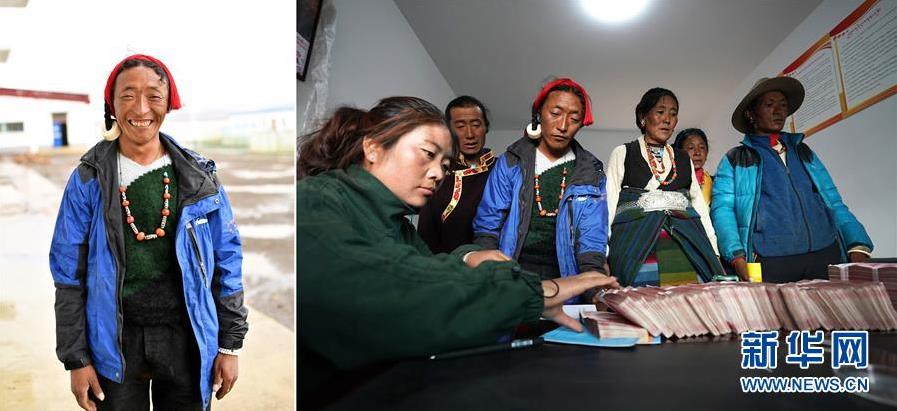 拼版照片:左圖為西藏日喀則市定日縣克瑪鄉(xiāng)幫布村村民阿羅;右圖為阿羅在幫布村牦牛養(yǎng)殖農(nóng)民專(zhuān)業(yè)合作社領(lǐng)工資。2019年,阿羅把家里的100多只羊入股了合作社享受分紅,自己也加入了合作社負(fù)責(zé)放羊,每個(gè)月有3000元的收入(7月31日攝)。 新華社記者 詹彥 攝