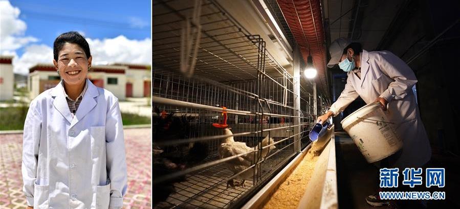 拼版照片:左圖為西藏日喀則市拉孜縣曲下鎮(zhèn)吉如村村民卓嘎;右圖為卓嘎在拉孜縣拉貴藏雞養(yǎng)殖孵化保種基地里忙碌。2020年年初,卓嘎來(lái)到拉貴藏雞養(yǎng)殖孵化保種基地工作,很快就學(xué)會(huì)了藏雞的養(yǎng)殖技術(shù),在這里工作,卓嘎每個(gè)月能拿到4000多元的工資(8月1日攝)。 新華社記者 詹彥 攝