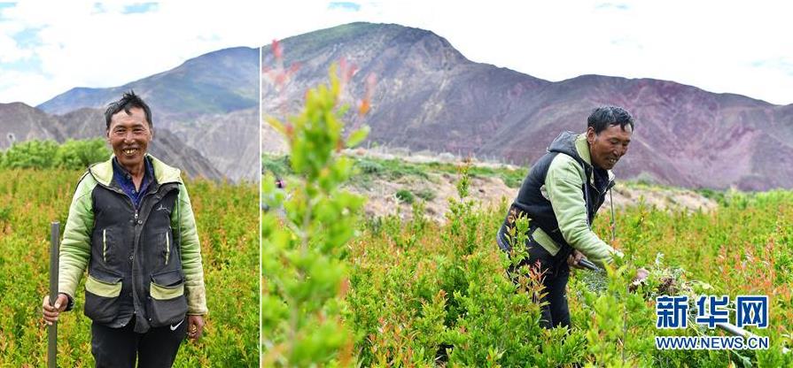 拼版照片:左圖為西藏昌都市芒康縣納西民族鄉(xiāng)加達(dá)村村民土登曲培;右圖為土登曲培在芒康縣納西民族鄉(xiāng)三江農(nóng)民專(zhuān)業(yè)合作社的苗圃里忙碌。幾年前,土登曲培來(lái)到三江農(nóng)民專(zhuān)業(yè)合作社打工,負(fù)責(zé)種樹(shù)和喂牛,每月有3000多元的收入(5月4日攝)。 新華社記者 詹彥 攝