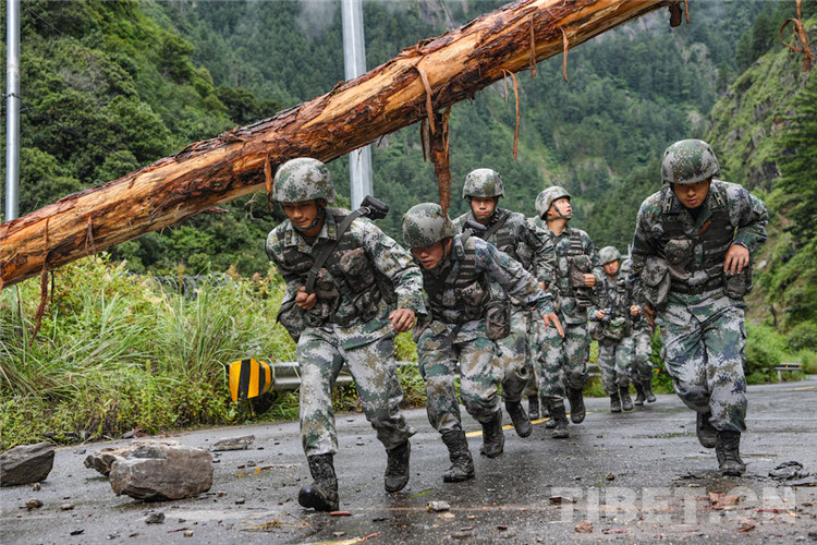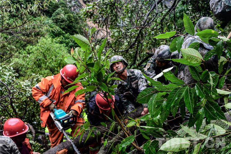“山體滑坡帶下來的亂石和粗大的樹干擋住了去路,塌方面積不大,現(xiàn)在挖掘機(jī)正在作業(yè),跟當(dāng)?shù)厝藛T溝通,他們說預(yù)計下午能搶通。” 巴桑爬上塌方的亂石堆觀察后,跑回來跟帶隊(duì)的副營長張為鵬報告情況。