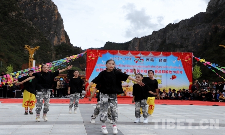 圖為昌都市崗托鎮(zhèn)小學生在豐收節(jié)表演舞蹈