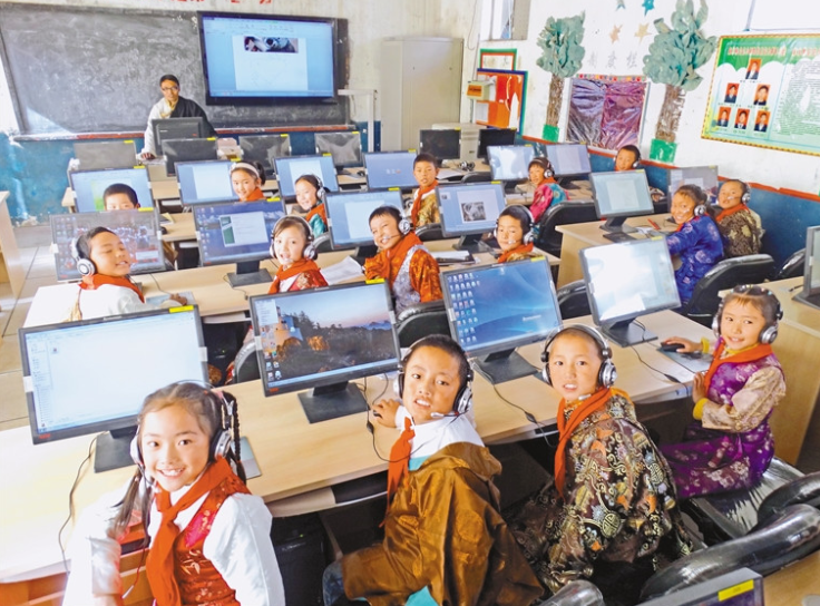 圖為西藏自治區(qū)日喀則市南木林縣完全小學的學生在上計算機課 攝影:楚武干