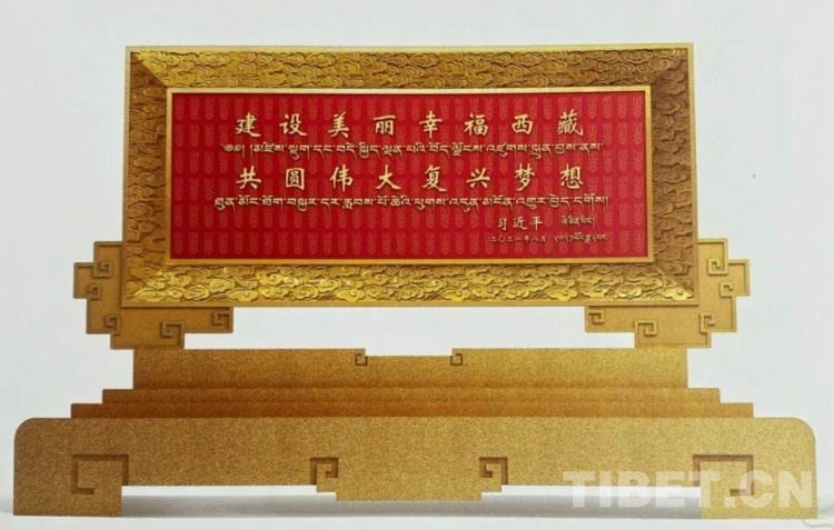 習(xí)近平總書記題詞的“建設(shè)美麗幸福西藏 共圓偉大復(fù)興夢(mèng)想”賀匾