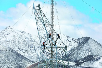 施工人員在西藏阿里與藏中電網(wǎng)聯(lián)網(wǎng)工程線路上作業(yè)。新華社發(fā)