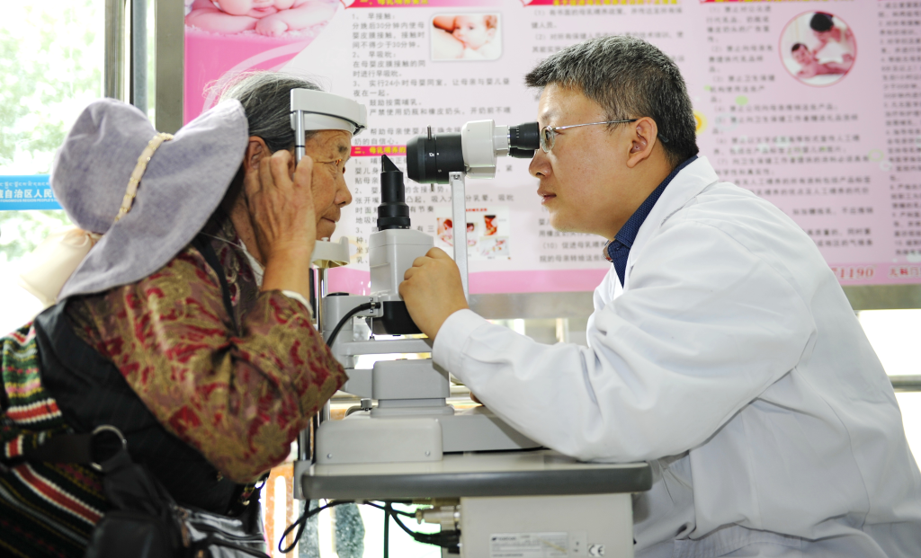 山東省立醫(yī)院青年志愿者為藏族婦女做眼部檢查。(2015年6月23日攝)新華社記者 張汝鋒 攝