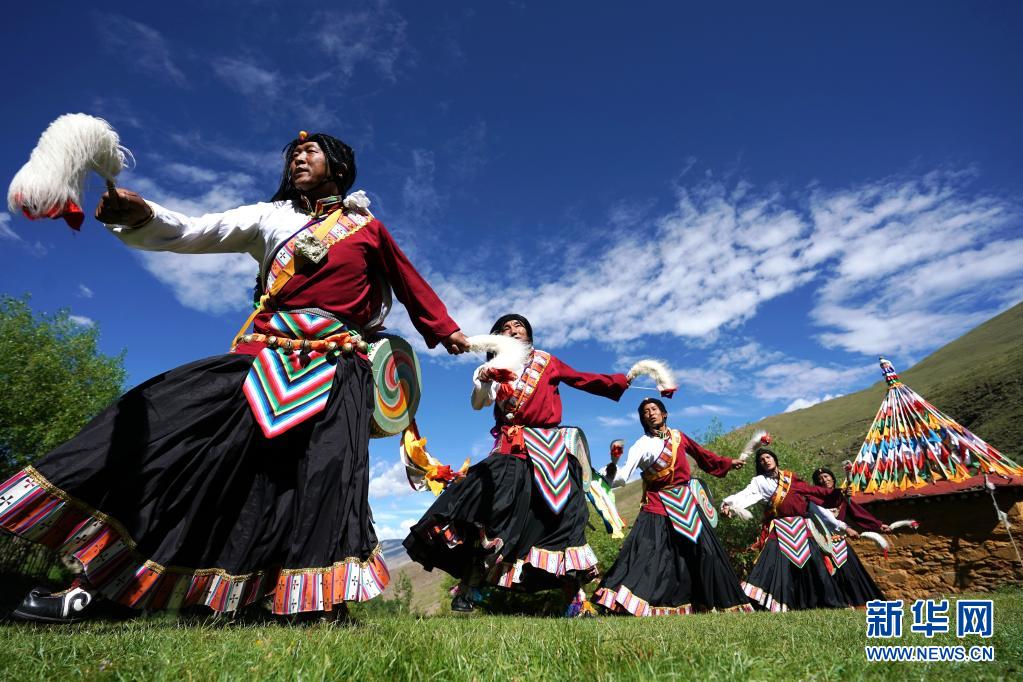 在山南市瓊結(jié)縣,久河村卓舞隊的隊員在表演國家級非遺項目“久河卓舞”(2020年7月1日攝)。新華社記者 詹彥 攝