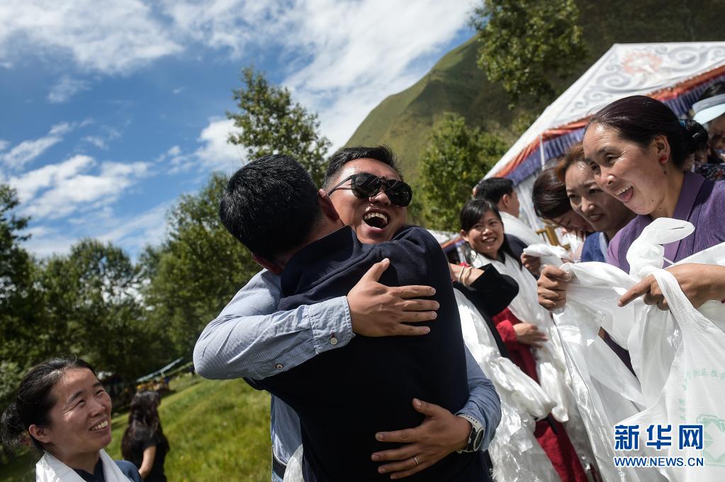 在西藏拉薩市達孜區(qū),北京大學腫瘤醫(yī)院的援藏醫(yī)生袁燦(戴墨鏡者)與送別的藏族同事?lián)肀В?020年8月1日攝)。新華社記者 彭子洋 攝