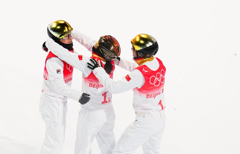 2月10日,中國隊選手徐夢桃(中)與隊友齊廣璞(左)、賈宗洋在北京冬奧會自由式滑雪空中技巧混合團體決賽后。新華社記者許暢攝