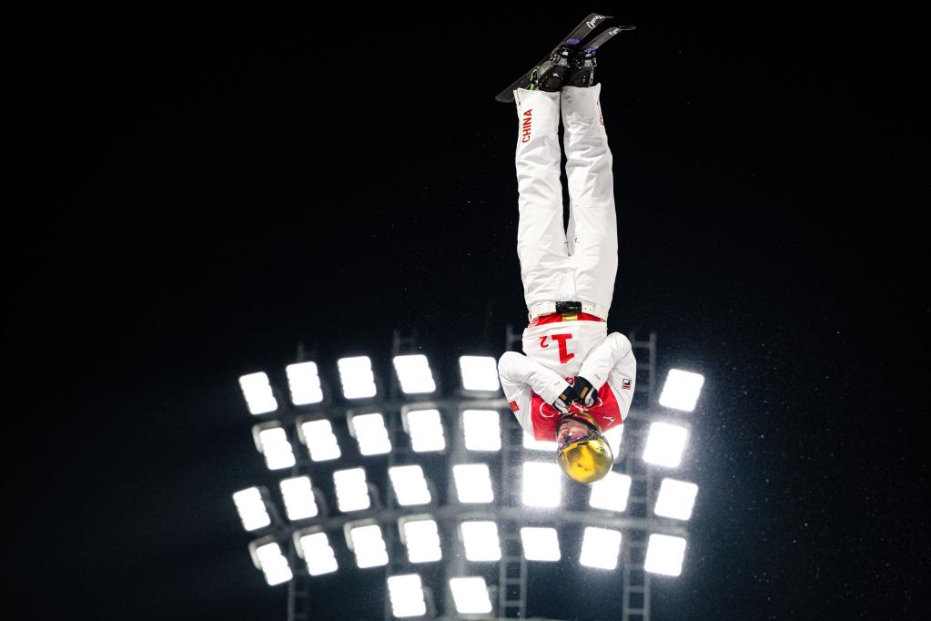 2月10日,中國隊選手賈宗洋在北京冬奧會自由式滑雪空中技巧混合團體決賽比賽中。新華社記者肖藝九攝