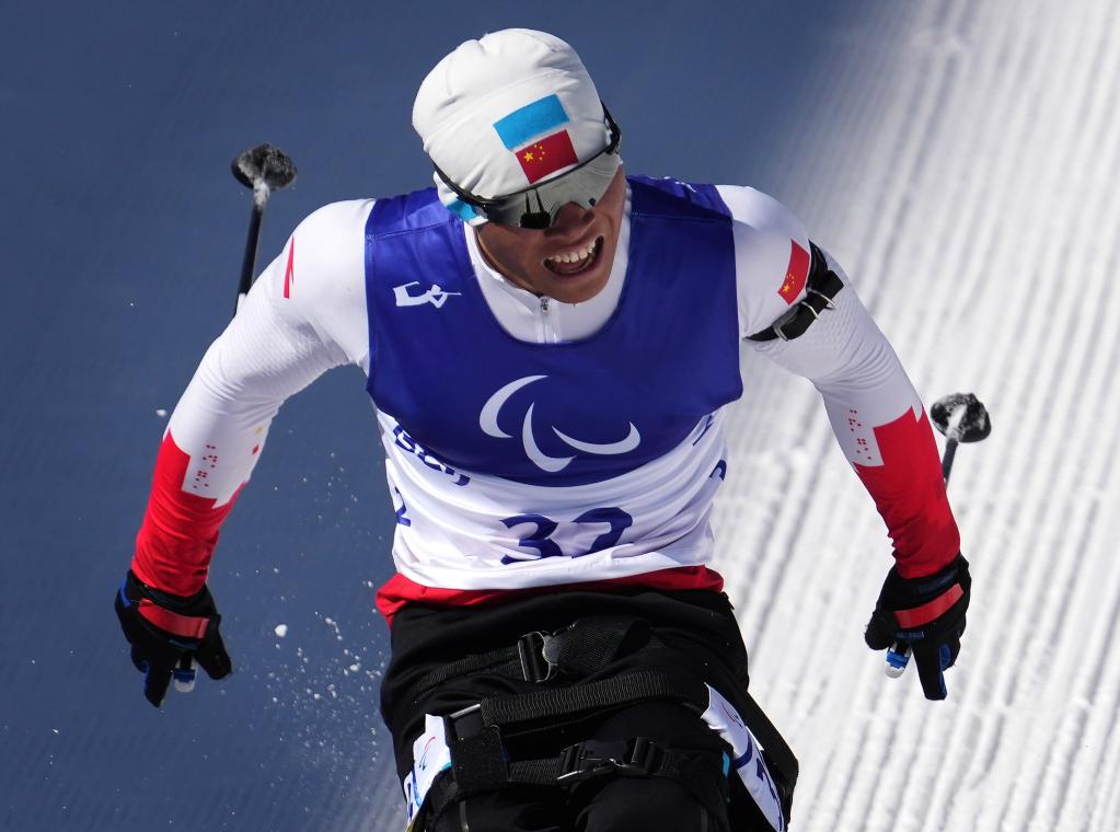 3月8日,中國選手劉夢濤在北京2022年冬殘奧會冬季兩項男子中距離(坐姿)比賽中獲得冠軍。新華社記者萬象攝