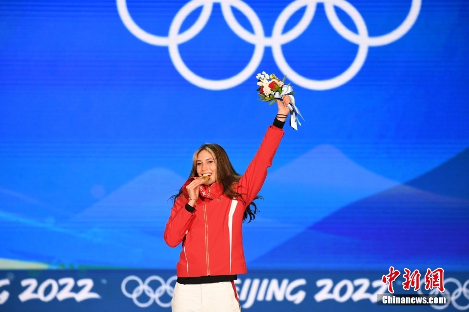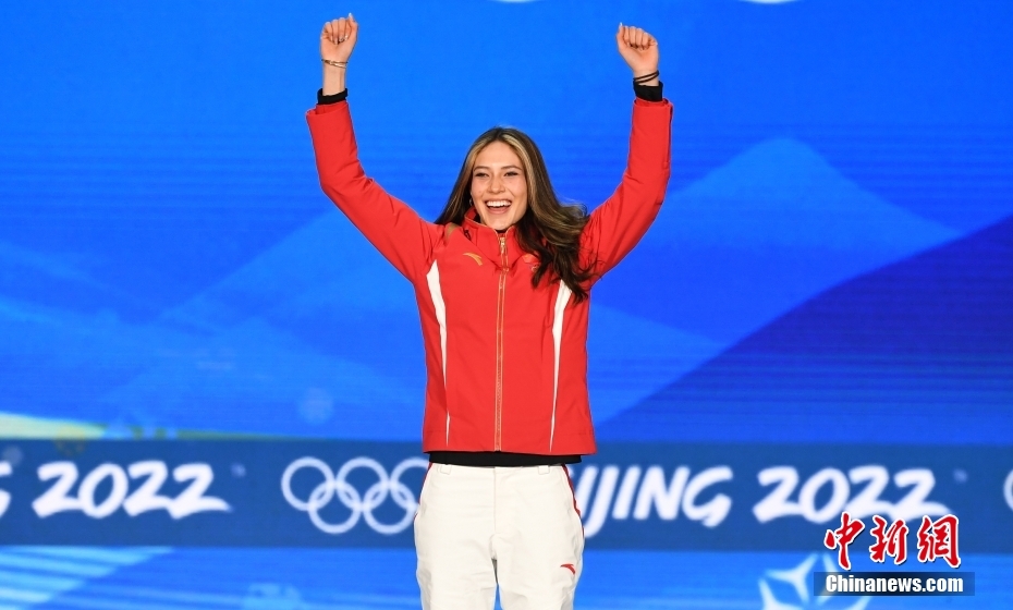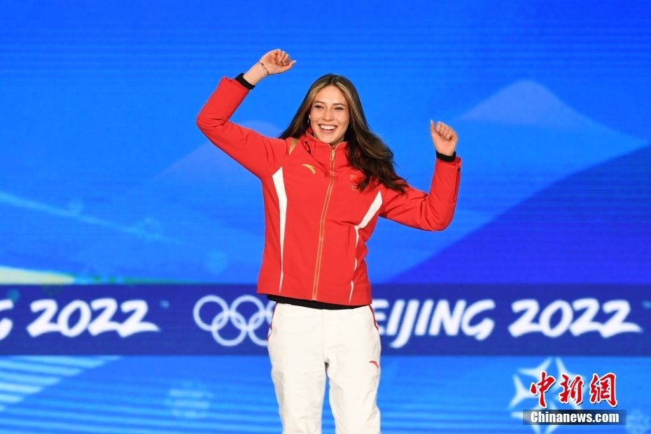 2月8日晚,北京冬奧會自由式滑雪女子大跳臺頒獎儀式在北京頒獎廣場舉行。圖為獲得冠軍的中國選手谷愛凌在頒獎儀式上。 中新社記者 李駿 攝