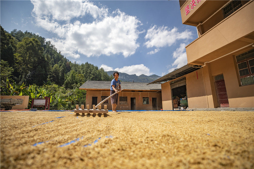 10月3日,重慶市酉陽土家族苗族自治縣花田鄉(xiāng)何家?guī)r村村民在晾曬水稻。新華社記者 黃偉 攝
