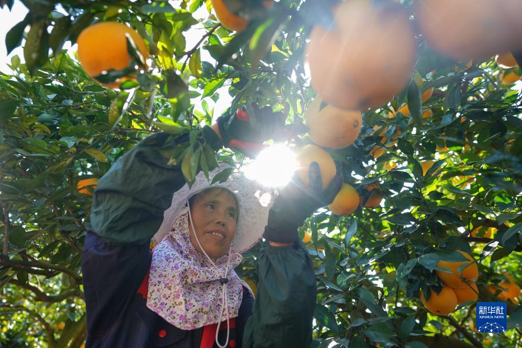 在江西省贛州市章貢區(qū)沙石鎮(zhèn)下茹村,果農(nóng)在采摘臍橙(2020年11月12日攝)。新華社記者 周密 攝