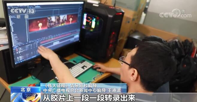 《偉大征程》情景短片編導(dǎo) 中央廣播電視總臺(tái)新聞中心編導(dǎo) 王遵濱:我們總臺(tái)的4K和8K的實(shí)驗(yàn)室做了高質(zhì)量修復(fù),有一些畫面素材因?yàn)樗嬖谝恍┪锢硇缘倪@種損傷,我們就聯(lián)系了新影廠。然后他們根據(jù)我們成片里用到的鏡頭,選取他們庫里相應(yīng)的內(nèi)容,從膠片上一段一段轉(zhuǎn)錄出來,我們再進(jìn)行節(jié)目的重新制作。