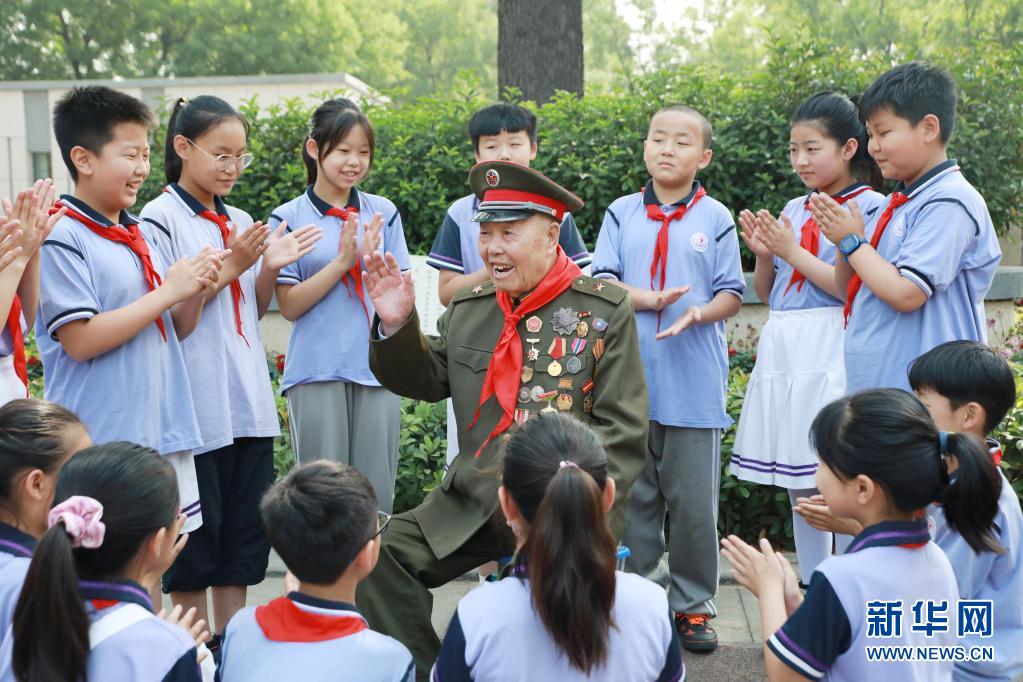 王占山(中)給河南省安陽市三官廟小學(xué)的少先隊員們講戰(zhàn)斗故事(6月11日攝)。新華社發(fā)(戴丹華 攝)