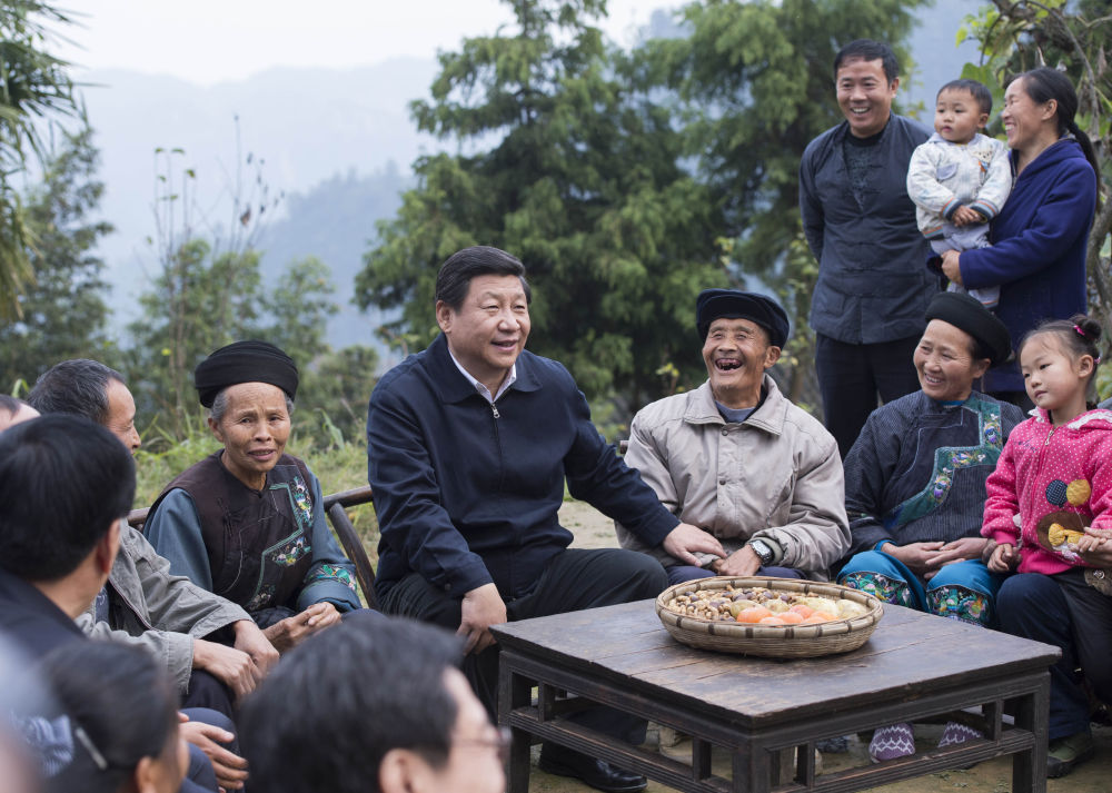 2013年11月3日,習近平在湖南湘西土家族苗族自治州花垣縣排碧鄉(xiāng)十八洞村同村干部和村民座談。