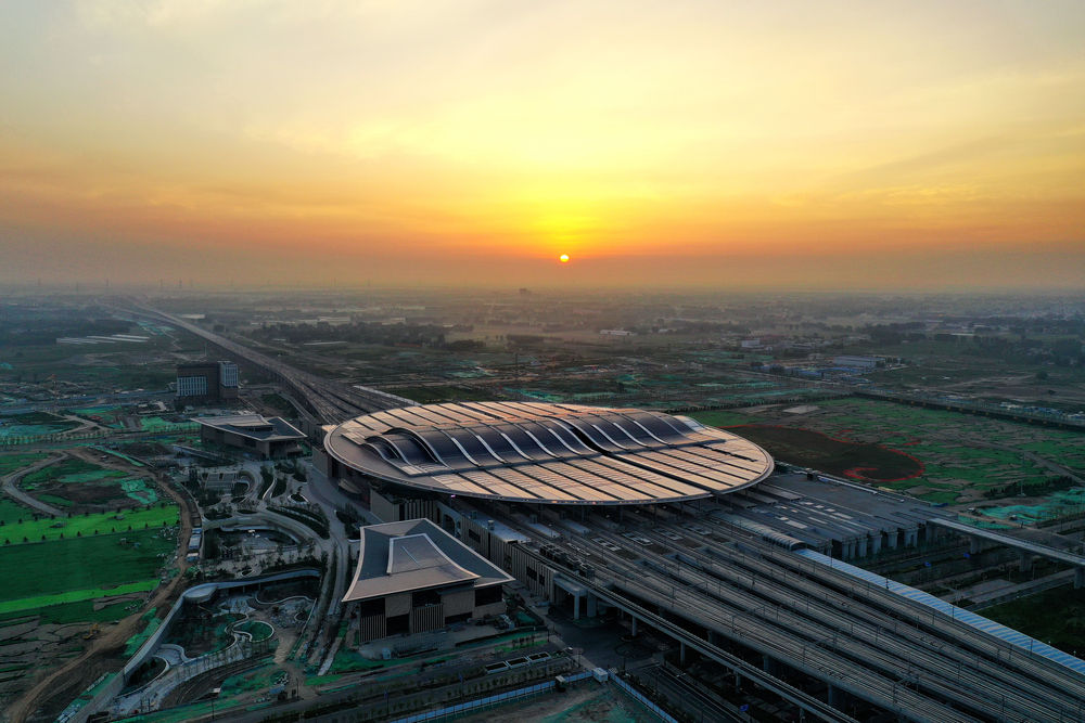 2021年7月1日在河北雄安新區(qū)京雄城際鐵路雄安站拍攝的日出(無人機照片)。