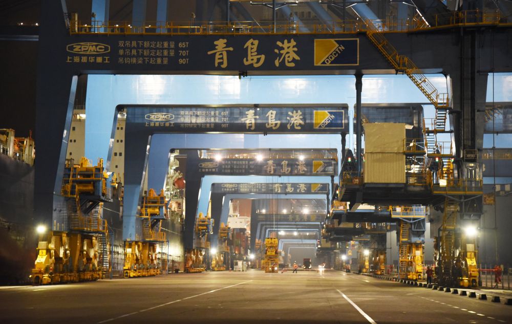 2021年7月1日凌晨拍攝的山東港口青島港全自動化集裝箱碼頭。
